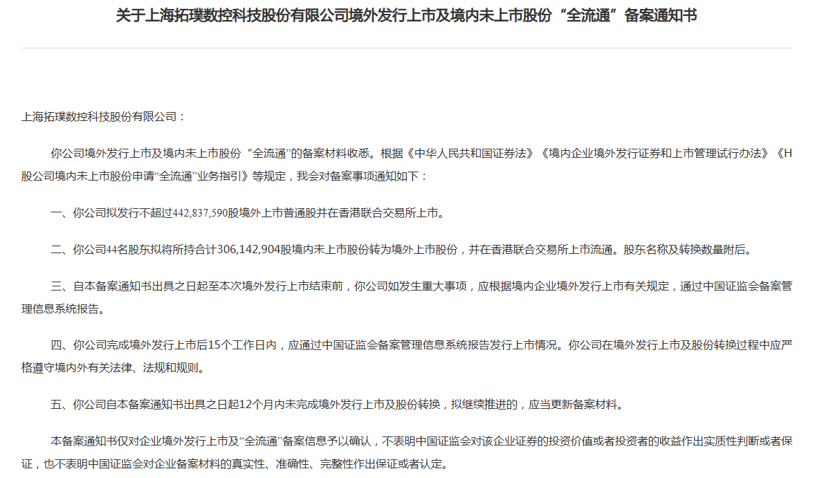 智通财经APP获悉,4月17日,中国证监会国际合作司发布《关于上海拓璞数控科技股份有限公司境外发行上市及境内未上市股份“全流通”备案通知书》。拓璞数控拟发行不超过442,837,590股境外上市普通股并在香港联合交易所上市。该公司44名股东拟将所持合计306,142,904股境内未上市股份转为境外上市股份,并在香港联合交易所上市流通。