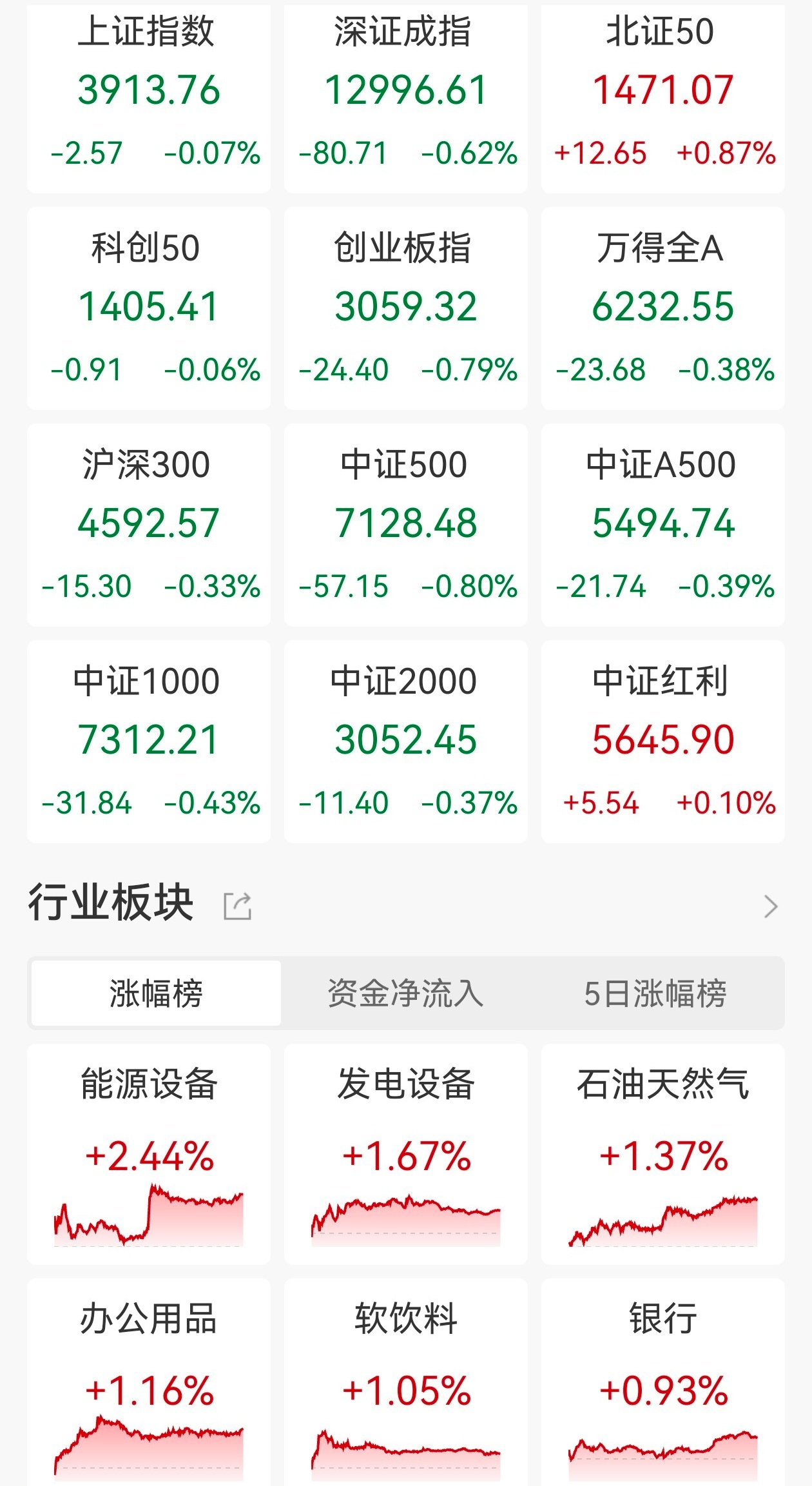 A股主要指数今日小幅走低,截至收盘,沪指跌0.07%报3913点,深证成指跌0.62%,创业板指跌0.79%。全市场成交额1.69万亿元,较前一交易日缩量2024亿元,超2900股下跌。 盘面上,可燃冰、页岩气等深地经济概念持续活跃,贝肯能源、石化油服等多股涨停;人造肉板块走高,爱普股份涨停;风电设备板块拉升,电气风电涨近12%;房地产板块拉升,云南城投涨停;工程机械板块活跃,建设机械涨停;娃哈哈概念、银行及维生素等板块涨幅居前。另外,黄金、白银遭抛售,贵金属板块下挫,湖南白银、西部黄金领跌;海南板块走低,海马汽车跌超8%;煤炭板块震荡下行,郑州煤电跌超7%;船舶制造、华为欧拉及MLCC等板块跌幅居前。(格隆汇)