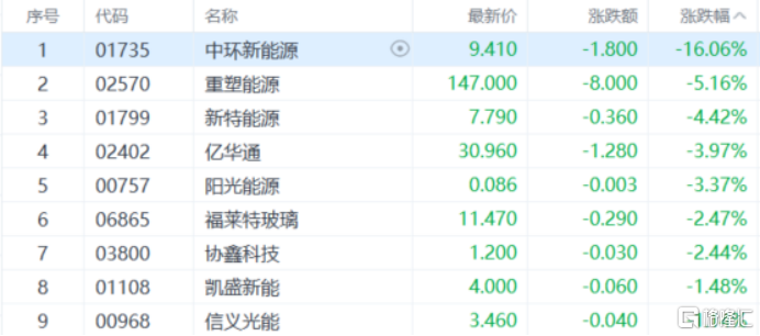 新能源物料板块下挫,中环新能源跌超16%,重塑能源、新特能源、亿华通、阳光能源、福莱特玻璃、协鑫科技等多股跟跌。