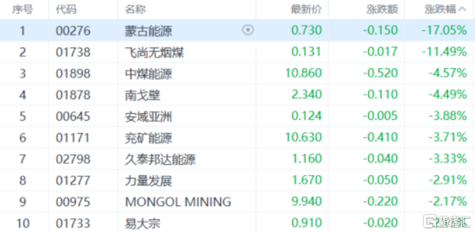 煤炭概念股走弱,蒙古能源跌超17%,飞尚无烟煤跌超11%,中煤能源、南戈壁、安域亚洲、兖矿能源、久泰邦达能源、力量发展等多股跟跌。