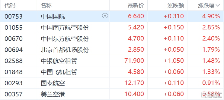 航空股再度走高,中国国航涨4.9%,南方航空、东方航空涨超2%,国泰航空、首都机场跟涨。