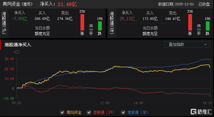 今日,南向资金净买入21.48亿港元,其中港股通(沪)净卖出7.65亿港元,港股通(深)净买入29.13亿港元。