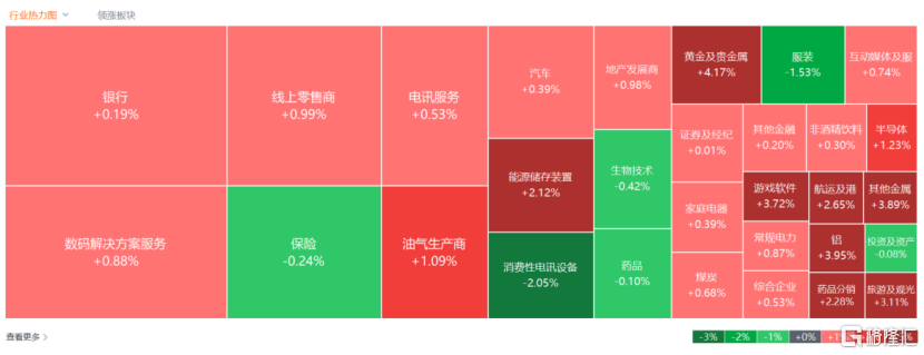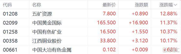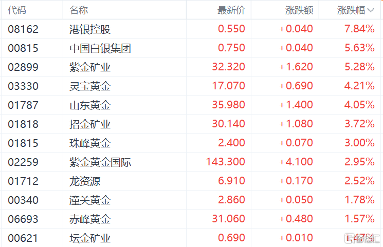 黄金及贵金属板块表现活跃,紫金矿业涨超5%,灵宝黄金、山东黄金涨超4%,招金矿业、珠峰黄金涨超3%,紫金黄金国际、龙资源、潼关黄金、赤峰黄金跟涨。