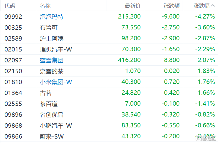 新消费概念股部分走低,泡泡玛特跌超4%,沪上阿姨、蜜雪集团跌超2%,奈雪的茶、古茗、茶百道、名创优品纷纷下跌。