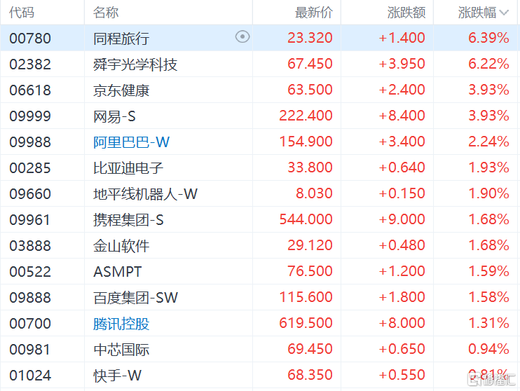 大型科技股多数出现上涨行情,网易涨近4%,阿里巴巴涨超2%,百度、腾讯涨超1.3%,京东小幅上涨0.52%。
