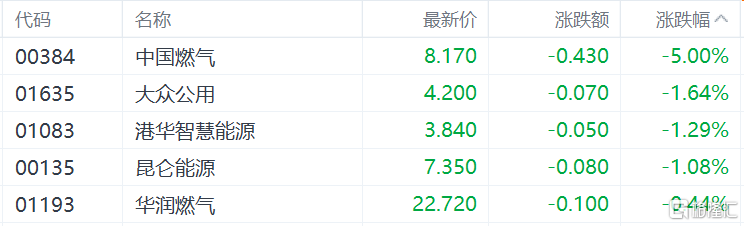 燃气股走弱,中国燃气跌5%,大众公用跌、昆仑能源跌超1%。