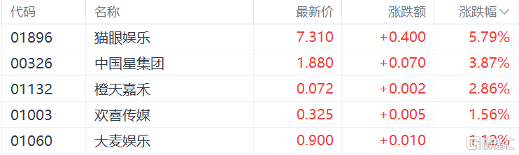 影视股上扬,猫眼娱乐涨5.79%,欢喜传媒涨1.56%,大麦娱乐涨1.12%。