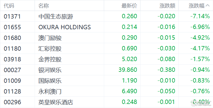 博彩股下跌,澳门励骏、汇彩控股跌超4%,金界控股、银河娱乐、永利澳门、英皇娱乐酒店纷纷下跌。