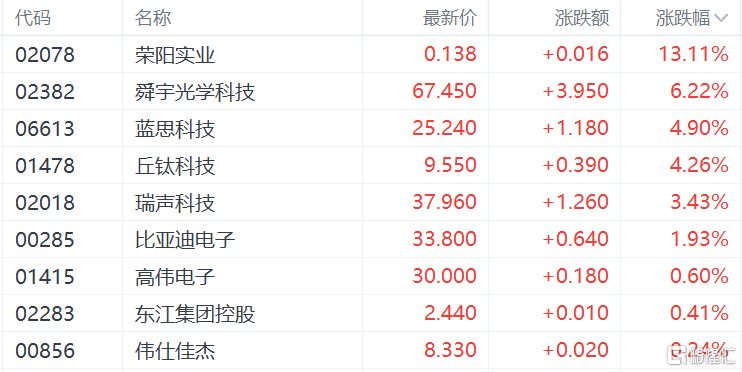 苹果概念股齐涨,荣阳实业涨超13%,舜宇光学科技涨超6%,蓝思科技、丘钛科技涨超4%,瑞声科技涨超3%,比亚迪电子、高伟电子跟涨。
