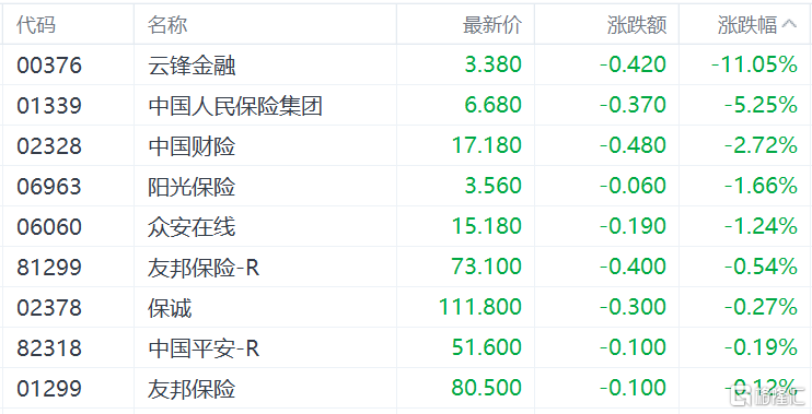 保险股部分走低,中国人民保险集团跌5.25%,中国财险跌2.72%,阳光保险、众安在线、友邦保险跟跌。