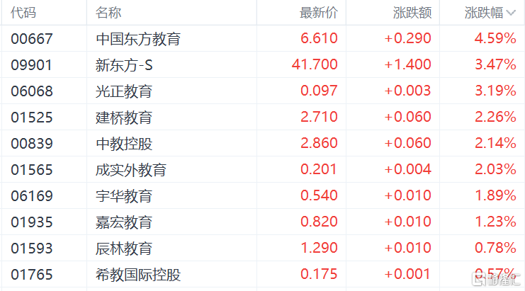 内地教育股部分飘红,中国东方教育涨超4%,新东方-S、光正教育涨超3%,建桥教育、中教控股、成实外教育涨超2%。