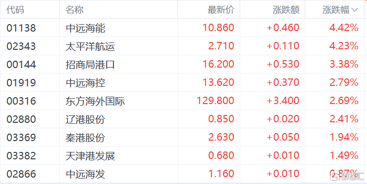 港口运输股普遍上涨,中远海能、太平洋航运涨超4%,招商局港口涨超3%,中远海控、东方海外国际、辽港股份涨超2%。