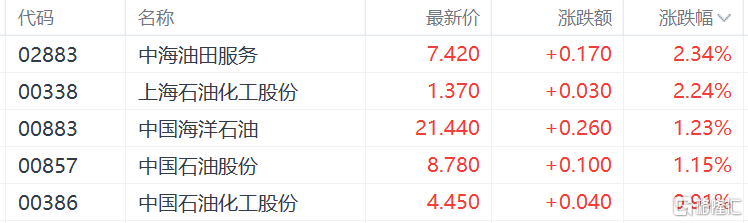 石油股上涨,中海油田服务、上海石油化工股份涨超2%,中国海洋石油、中国石油股份涨超1%。