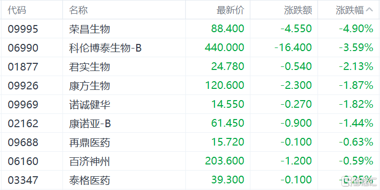 生物医药股表现低迷,荣昌生物跌4.9%,科伦博泰生物-B跌3.59%,君实生物跌2.13%,康方生物、诺诚健华跌超1%。