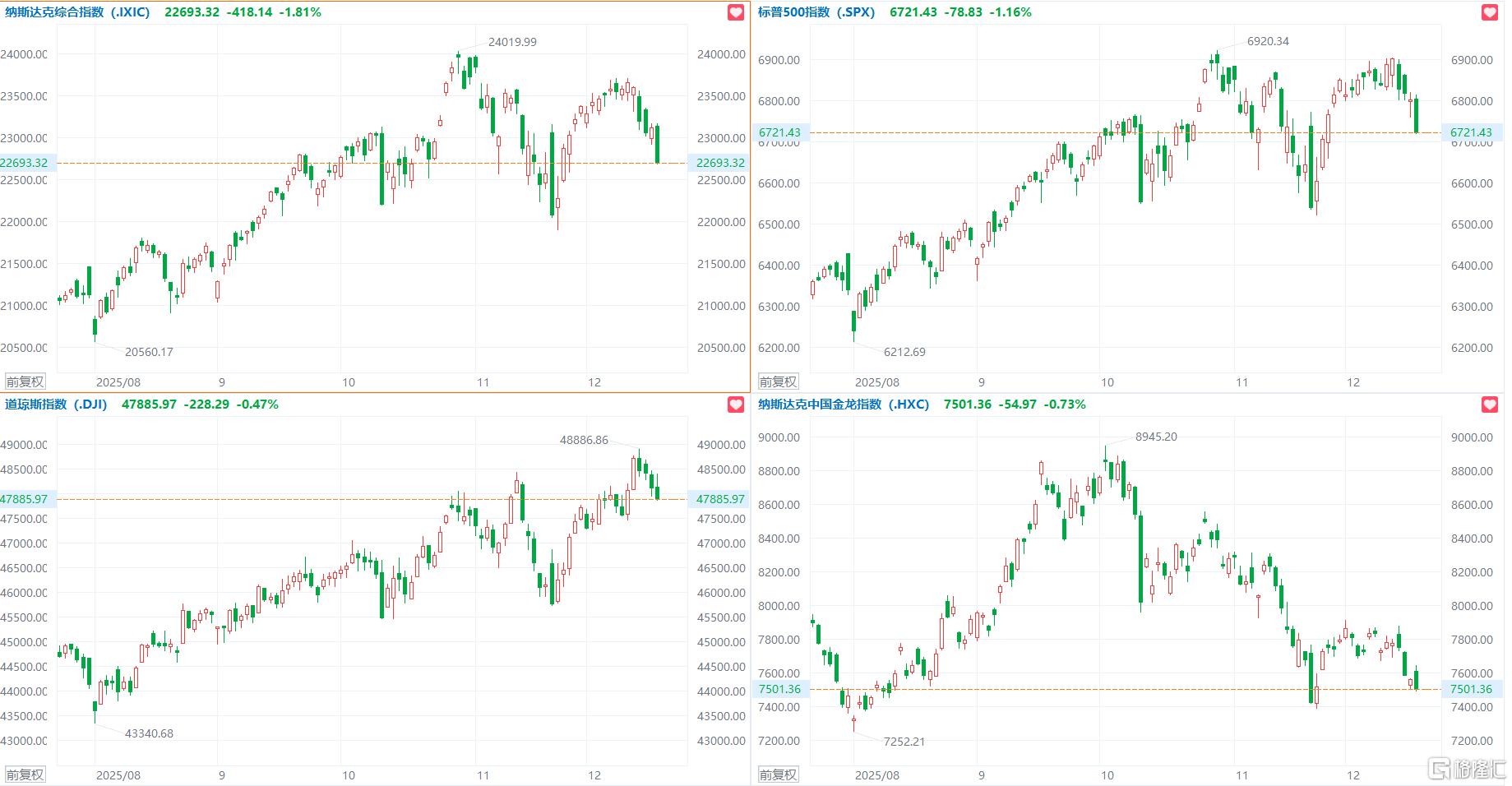 美股三大指数集体收跌,道指跌0.47%,纳指跌1.81%,标普500指数跌1.16%,大型科技股普跌,甲骨文跌超5%,特斯拉、博通跌超4%,英伟达、谷歌跌超3%,Meta、苹果跌超1%。