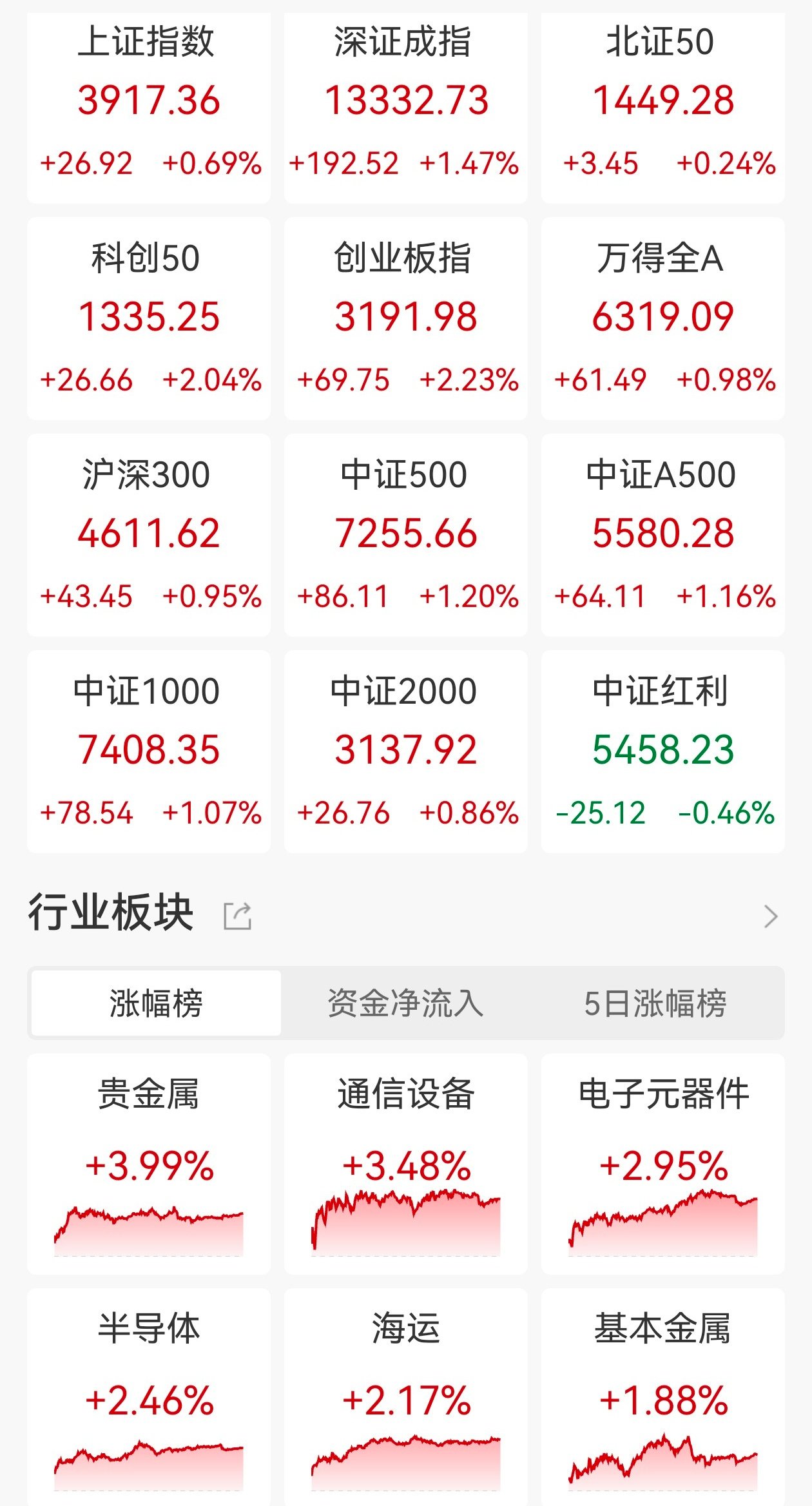 A股主要指数今日高开高走,截至收盘,沪指涨0.69%报3917点,深证成指涨1.47%,创业板指涨2.23%,科创50指数涨2.04%。全市场成交额1.88万亿元,较前一交易日增量1335亿元,近3000股上涨。 盘面上,近日海南自由贸易港全岛封关运作正式启动,海南板块大爆发,神农种业、海南机场及海马汽车等二十余股涨停;三亚免税店销售额连续三日破亿元,免税概念走强,中国中免等多股涨停;国际金银价格齐创历史新高,贵金属板块走高,晓程科技涨超7%;CPO概念活跃,长飞光纤涨停;F5G概念、中芯概念、通信设备及PCB等板块涨幅居前。另外,SPD概念走低,华人健康跌逾9%;教育板块下挫,中国高科跌停;盲盒、谷子经济及银行等板块跌幅居前。(格隆汇)