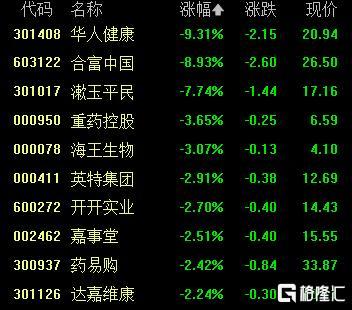 医药商业股跌幅居前,华人健康跌超9%,合富中国跌超8%,漱玉平民跌超7%,海王生物、英特集团、开开实业等跟跌。