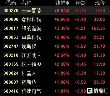 机器人概念全线上涨,三丰智能涨超8%,瑞松科技涨超6%,绿的谐波、申昊科技、拓斯达等跟涨。