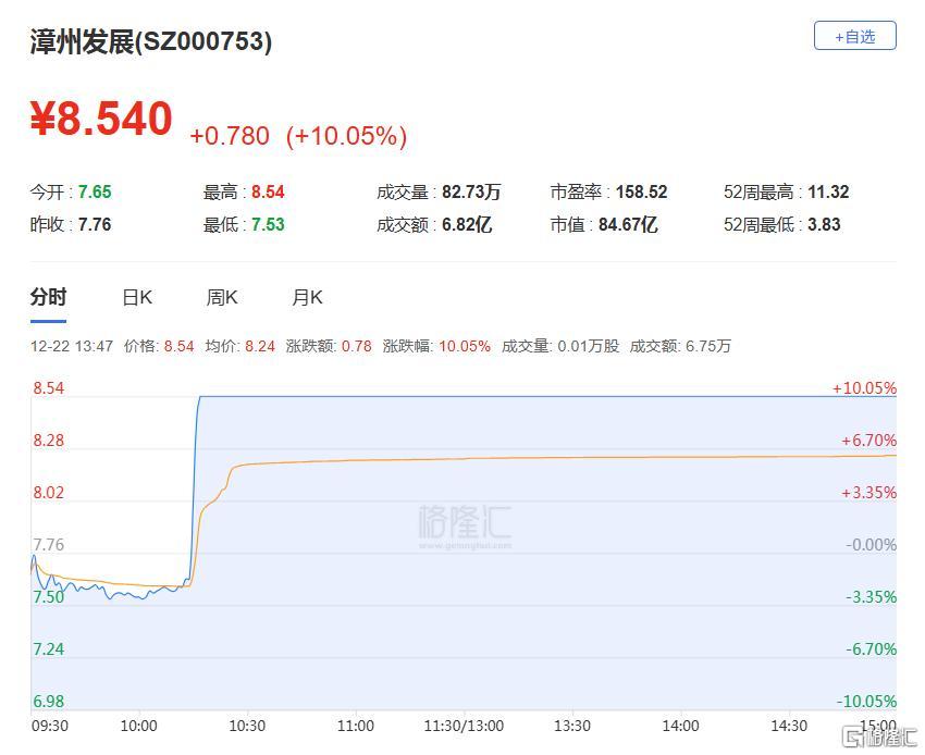 漳州发展直线拉升封涨停板,报8.54元。福建漳州“十五五”规划建议提出,着力深化漳台“五大板块”融合打造两岸融合发展先行城市。