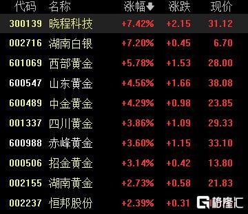 贵金属股大涨,晓程科技、湖南白银涨超7%,西部黄金涨超5%,山东黄金、中金黄金涨超4%,四川黄金、赤峰黄金等跟涨。