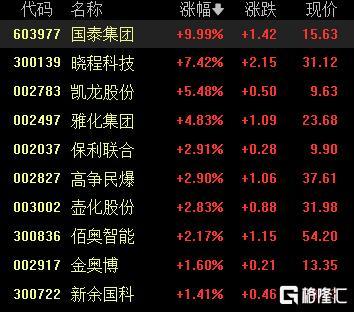 民爆概念股走强,国泰集团涨停,晓程科技涨超7%,凯龙股份涨超5%,雅化集团、保利联合、高正民爆等跟涨。