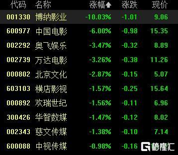 影视股跌幅居前,博纳影业跌停,中国电影跌超6%,奥飞娱乐、万达电影跌超3%,北京文化、横店影视等跟跌。