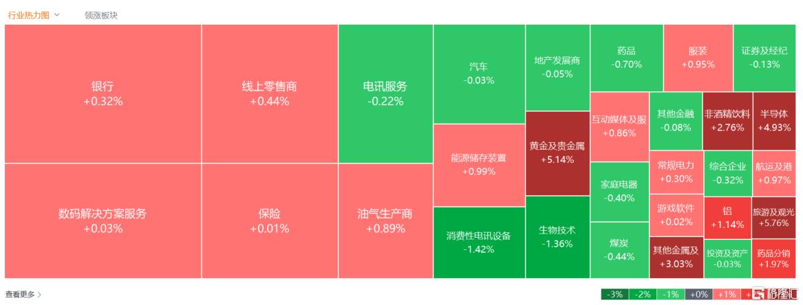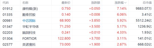 盘面上,大型科技股普遍上涨但波动相对较小,半导体芯片股、光通讯板块上涨明显,龙头中芯国际盘中涨超8%;免税概念股持续活跃,免税龙头中国中免大涨近16%领跑;黄金白银股全天活跃,铜等有色金属股跟涨。