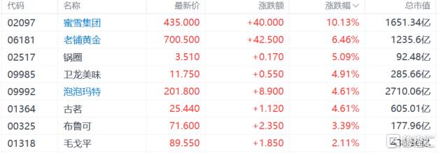 新消费概念股走强,蜜雪集团涨近10%,老铺黄金涨超6%,锅圈涨超5%,泡泡玛特、卫龙美味等涨超4%。消息面上,12月20日,商务部党组扩大会议在京召开。会议强调,大力提振消费,扩大优质商品和服务供给,释放服务消费潜力。