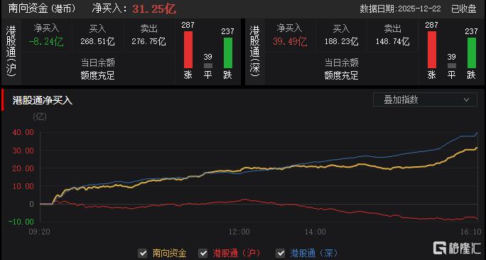 今日,南向资金净买入31.25亿港元,其中港股通(沪)净卖出8.24亿港元,港股通(深)净买入39.49亿港元。