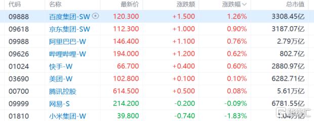 大型科技股普遍微涨,快手、京东、阿里巴巴、腾讯涨幅在1%以内,小米集团爹超1%。