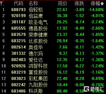 小家电板块下跌,倍轻松跌超14%,倍益康跌4%,德昌股份、欧圣电器跌超2%。
