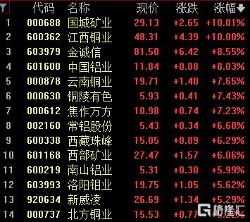 工业金属板块创新高,国城矿业、江西铜业涨停,金诚信、中国铝业涨超8%.