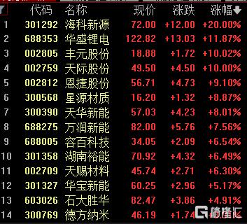 电池板块上涨,海科新源20cm涨停,华盛锂电涨超11%,丰元股份、天际股份涨停。