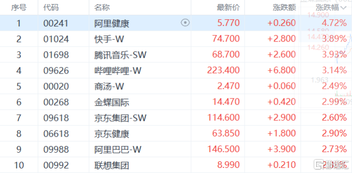 大型科技股走势分化,快手、腾讯音乐、哔哩哔哩涨超3%,阿里巴巴、京东涨超2%,百度、美团跌超2%,腾讯小幅走低。