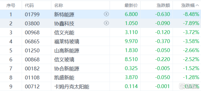 光伏股下挫,新特能源跌超8%,协鑫科技跌超7%,信义光能、福莱特玻璃、山高新能源、信义玻璃、协合新能源等多股跟跌。