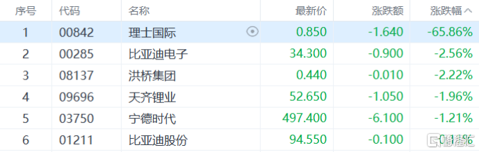 电池股走弱,理士国际跌超65%,比亚迪电子、洪桥集团、天齐锂业、宁德时代等多股跟跌。