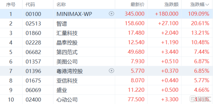 人工智能股走强,MINIMAX-WP今日上市,暴涨109%,智谱上市第二日大涨超20%再创新高,市值一度站上720亿港元,汇量科技、晶泰控股等多股跟涨。