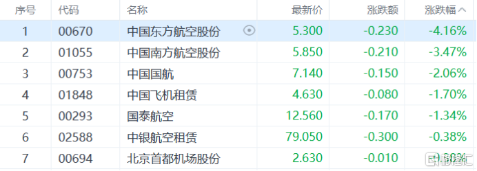 航空股回落,中国东方航空股份跌超4%,中国南方航空股份跌超3%,中国国航、中国飞机租赁、国泰航空等多股跟跌。