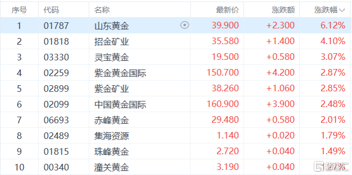 黄金股上涨,山东黄金涨超6%,招金矿业涨超4%,盘中刷新历史新高价,灵宝黄金、紫金黄金国际、紫金矿业等多股跟涨。