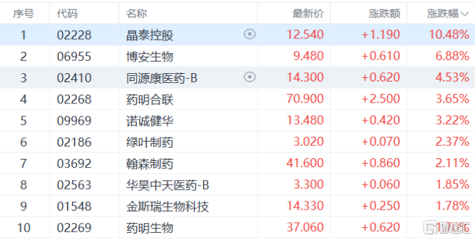 创新药概念股活跃,晶泰控股涨超10%,博安生物涨超6%,同源康医药-B、药明合联、诺诚健华等多股跟涨。