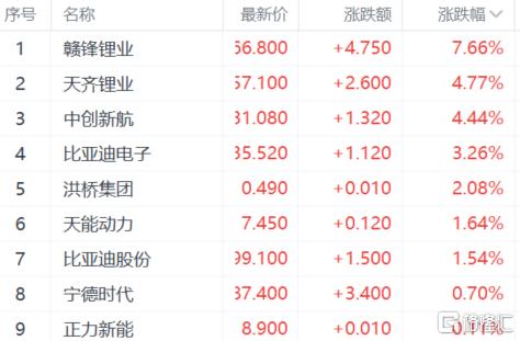 锂电池板块上涨,赣锋锂业涨超7%,天齐锂业、中创新航涨超4%,比亚迪股份涨超3%。