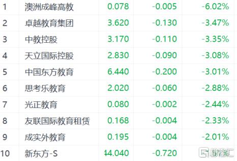 教育板块走低,澳洲成峰高教跌超6%,天立国际控股、中教控股、卓越教育集团、中国东方教育跌超3%。