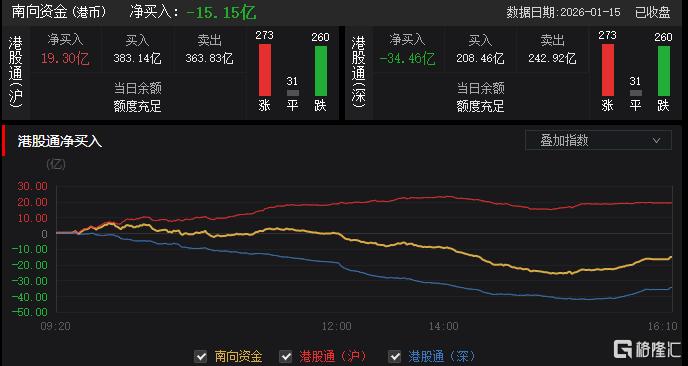 今日,南向资金卖出15.15亿港元,其中港股通(沪)净买入19.3亿港元,港股通(深)净卖出34.46亿港元。