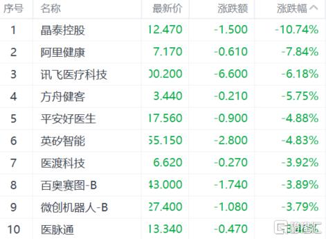 经过半个月的上涨趋势,AI医疗概念股集体回撤,晶泰控股跌超10%,阿里健康跌超7%,讯飞医疗科技跌超6%,方舟健客跌超5%。