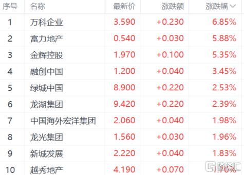 内房股回升,万科企业涨超6%,富力地产、金辉控股涨超5%,融创中国涨超3%。