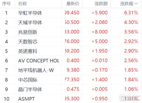 芯片板块延续涨势,华虹半导体涨超6%,天域半导体涨超4%,兆易创新涨超3%,天数智芯涨超2%。