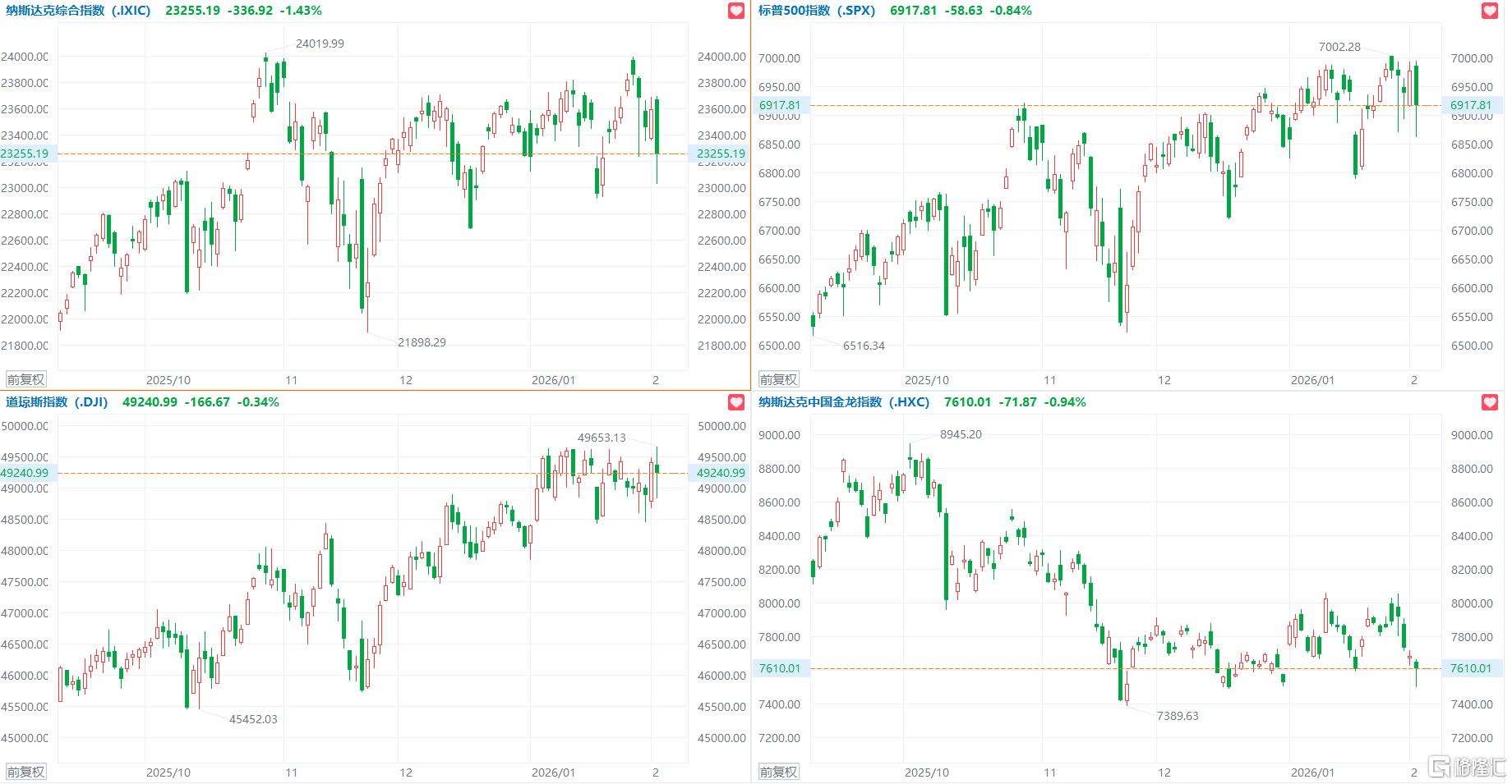 美股三大指数集体收跌,道指跌0.34%,纳指跌1.43%,标普500指数跌0.83%,热门科技股普跌,博通跌超3%,微软、英伟达、Meta跌超2%。稀土概念、有色金属、贵金属涨幅居前,黄金资源涨超20%,南方铜业涨超11%,美洲白银公司涨超8%,泛美白银涨超5%。应用软件、加密货币、减肥药概念股跌幅居前,诺和诺德跌超14%,Coinbase、Circle跌超4%,礼来、辉瑞跌超3%。沃尔玛收涨2.94%,市值首次突破1万亿美元大关。