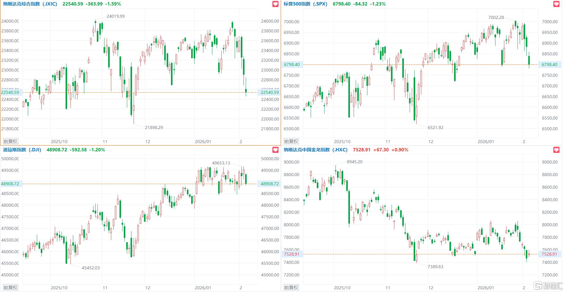 美国1月挑战者企业裁员人数升至2009年以来同期最高,美股三大指数集体收跌,道指跌1.2%,纳指跌1.59%,标普500指数跌1.23%,热门科技股普跌,超微电脑、高通跌超8%,微软跌近5%,亚马逊跌超4%,AMD跌超3%,特斯拉跌超2%,英伟达跌超1%。