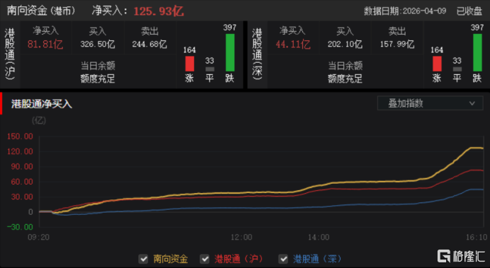 今日,南向资金净买入125.93亿港元,其中港股通(沪)净买入81.81亿港元,港股通(深)净买入44.11亿港元。
