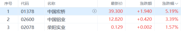铝业股走强,中国宏桥涨超5%,中国铝业涨超3%。